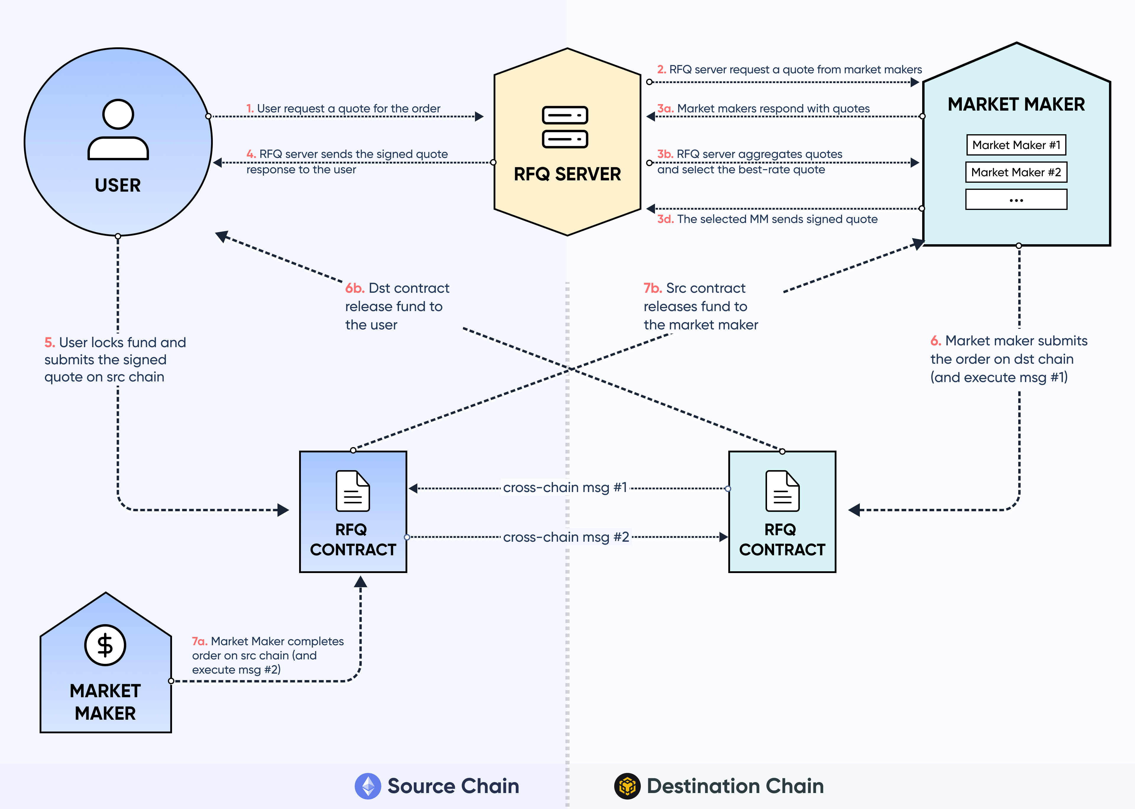 To illustrate the cross-chain trade process, let’s walk through a common use case: a user wants to swap Token X on Chain A for Token Y on Chain B. This transaction is handled as a Request for Quote (RFQ) order.