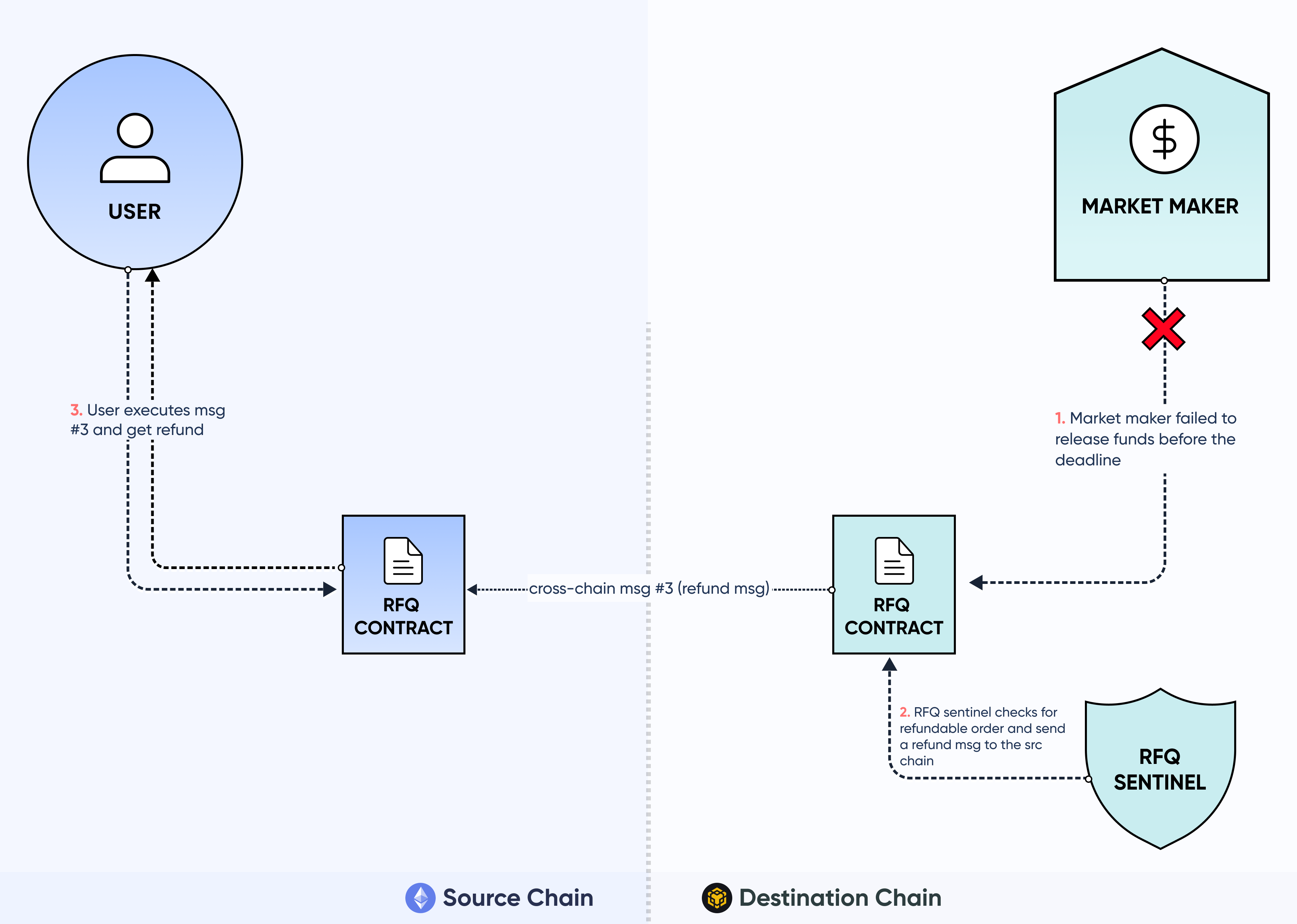 If the market maker does not complete the transfer of destination tokens to the user before the designated destination release deadline, the RFQ order transitions into a refundable state on the destination chain.